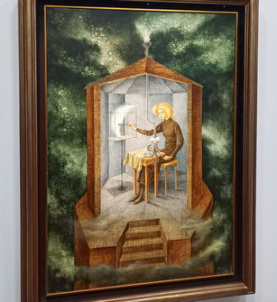 Die Schau ist völlig überfüllt. Da es zunehmend schwierig wird, sich ob der Besuchermenge einen Überblick zu verschaffen, fokussieren wir uns auf einzelne Werke. Die großen Namen des Surrealismus sind allesamt vertreten: Mereth Oppenheim, Max Ernst, Miró, Salvador Dali – und immer wieder Magritte. Leise, rätselhaft und hintergründig hängen seine Werke so elegant wie bescheiden zwischen den vielen Skurrilitäten. Seine Form des Surrealismus basiert nicht auf Absurdität. Nüchtern geht er malerisch zu Werke, indem er den Objekten des Alltags ihre kontextuelle Zugehörigkeit raubt und Zusammenhänge erschafft, die in einer auf Naturgesetzen beruhenden Welt so nicht vorgesehen sind. „L'Empire des lumières“ ist eines jener Bilder, dessen feine Ironie sich erst auf den zweiten Blick entdeckt. Ein weiß gestrichenes, von einer davorstehenden Laterne beleuchtetes Haus spiegelt seine nächtliche Silhouette in den See. Von idyllischer Vertrautheit erscheint jene Szenerie, die jedoch die Erwartung, von einem samtenen Nachthimmel überwölbt zu werden, enttäuscht. Hell strahlt hier stattdessen ein von flockigen Wölkchen gepunktetes Sommerblau.