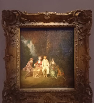 1826 wird das Bild zum ersten Mal erwähnt. Dominique Vivant Denon, der schillernde erste Direktor des Louvre und räuberischer Kunstagent Napoleons hatte das Gemälde in seine Privatsammlung aufgenommen. Woher es stammte, wer Auftraggeber oder früherer Besitzer war, ist unbekannt. Vermutet wird ein naheliegender Zusammenhang mit der Theaterwelt, in der das Werk vielleicht als Werbetafel diente. Ungewöhnlich sind Format und Größe. Watteau ist bekannt für seine filigranen von einzigartig koloristischem Liebreiz funkelnden kleinen Querformate, von denen in der Ausstellung auch einige zu sehen sind. Das schönste ist das Bildchen aus der Sammlung Thyssen-Bornemisza. Hier sitzt ein ebenfalls weiß gekleideter Pierrot umgeben von einer kleinen Gruppe Männer und Frauen auf einem Bänkchen. Als würde er gerade eine Pause machen, um sich von seinen Späßen auszuruhen, scheint er in der friedlichen Parklandschaft wie der zufriedene Bruder des Pariser Gilles, dessen verloren wirkende Pose im schlecht sitzenden Gewand von rührender Unbedarftheit zeugt. Diese Einfachheit der Kleidung erlaubt Watteau eine beispiellose Präsentation seiner koloristischen Virtuosität. Dem klaren Weiß, jener Nichtfarbe, entlockt er all ihre schimmernden Facetten und Nuancen, was dazu führt, dass dieser lichthell strahlende Pierrot, in besonders auffälliger Weise den Blicken seines Publikums ausgeliefert ist. Traurig steht der Kontrast zwischen Kostüm und individueller Wesenheit frontal vor uns. Mit berückender Aufrichtigkeit, die jedoch nicht auf Kosten der ästhetischen Anziehungskraft geht, weist der sonst so leichthändige Künstler Watteau auf die spannungsreiche Diskrepanz von Sein und Schein hin.