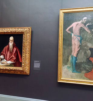 Hin und wieder unternehmen Kuratoren den Versuch den großen Rätselträgern in der Malerei durch ein spannendes Gegenüber vielleicht doch ein bisschen mehr zu entlocken als diese für gewöhnlich bereit sind zu verraten. So bestaunen wir in einem Raum das faszinierende Nebeneinander zweier Bilder von El Greco und Picasso. Hängungen, die durch Gemäldenachbarschaften Jahrhunderte zum Schmelzen bringen, waren in der letzten Zeit sehr en vogue. Häufig nur auf den schnellen Effekt hin ausgerichtet, versprachen sie meist auf den ersten Blick mehr, als sie dann inhaltlich erfüllten. Hier verhält es sich anders. Zurückgenommen und vornehmlich getragen von der gemeinsamen koloristischen Eleganz, beginnen die Bilder sich durch ihr Gegenüber zu vertiefen. Streng, frontal und unbewegt sitzt El Grecos Hieronymus bei seinen Studien. Mit tänzerischer Leichtigkeit schwingt der biegsame Rücken von Picassos Schauspieler ihm entgegen. Nur eine physische Abkehr scheint es jedoch zu sein. Die Aufmerksamkeit überwindet Rahmengrenzen mühelos, da jedem auf seine ganz individuelle Weise ein unabdingbares Interesse an der Welt zu eigen ist. Der Kirchenlehrer Hieronymus äußert sie in seinen Schriften. Der Schauspieler offenbart sie in seinen Gesten. Mit diesem Bild eröffnete Picasso seine rosa Periode, in der er seiner Begeisterung für den Zirkus und die Artistenwelt sanfte Farben verlieh.